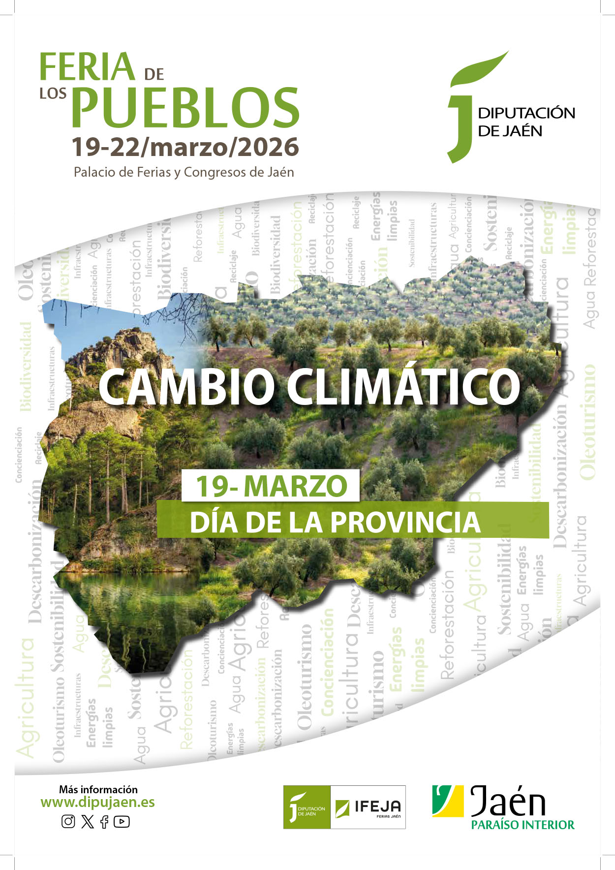 Nombre ComercialFERIA DE LOS PUEBLOS DE LA PROVINCIA DE JAÉN OrganizaDIPUTACIÓN PROVINCIAL DE JAÉN ColaboraIFEJA Fecha de CelebraciónDel 19 al 22 de Marzo de 2026 ObjetivoTrasladar una imagen de la provincia de Jaén y sus pueblos potente, atractiva, moderna, innovadora, habitable… tanto para los propios habitantes como para el exterior. Tipo de FormatoLa Feria de los Pueblos de la Provincia de Jaén se desarrolla a través de la creación de un espacio expositivo donde se muestra la riqueza de nuestros municipios y donde los visitantes pueden interactuar del gran número de exposiciones y actividades paralelas, así como de talleres, desfiles, actuaciones de música o danza, degustaciones gastronómicas… TemáticaEn la pasada edición, la temática de la feria se centró en LA SOSTENIBILIDAD Y EL CAMBIO CLIMÁTICO. “La contribución de la provincia de Jaén para paliar los efectos del cambio climático y las medidas que se están llevando a cabo en materias tan importantes como reciclaje, residuos o producción y consumo de productos ecológicos, que permiten por otro lado, la disminución de la huella de carbono” InstalacionesPabellón Interior del Recinto Provincial de Ferias y Congresos de Jaén. Público al que va dirigidoPara todos los públicos, tanto de la provincia como de fuera de ella. Acceso GRATUITO. Cartel Edición 2026 |